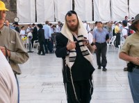 Left, man with phylactery on head and tefillin on arm.