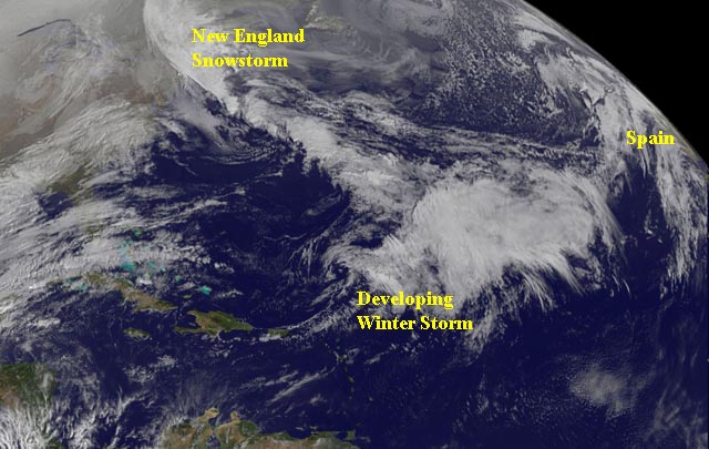 A large but disorganized extratropical storm located over the middle-Atlantic Ocean is expected to move rapidly eastwards towards Spain over the next two days. As the storm approaches Spain on Friday, it is expected to tap into a cold polar airmass to its north and rapidly intensify into a meteorological “bomb”–a mighty winter cyclone with hurricane force winds. Though sea surface temperatures off the coast of Spain are about 1°C below average, the waters of 12 – 16°C will provide plenty of moisture and energy to the powerful storm, which may end up rivaling last year’s Winter Storm Klaus in intensity. … It is expected to “come ashore over Ireland Sunday morning with a pressure of 956 mb. This is a central pressure typically found in Category 2 hurricanes! … Even so, this weekend’s storm has the potential to be a multi-billion dollar weather disaster for Europe.”