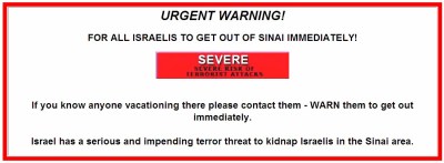 Counter-Terrorism Bureau issued a travel warning to Israelis going to and residing in Sinai. Warning is based on concrete intelligence information about a plot to kidnap Israelis in Sinai. On Tuesday night (April 13), the Counter-Terrorism Bureau issued a travel warning to Israelis going to and residing in Sinai. “In light of this grave and immediate threat, the Counter-Terrorism Bureau urges all Israelis to leave Sinai immediately and without delay,” the advisory said. The decision was based on information that a terror cell in Sinai intends to abduct Israeli citizens and immediately transfer them to the Gaza Strip.