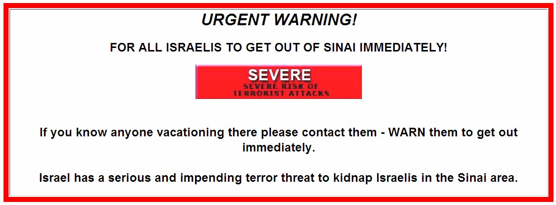 Counter-Terrorism Bureau issues unusually harsh warning, urges Israelis in Sinai to leave Egypt immediately in light of ‘substantive intelligence information’ about serious abduction plot.