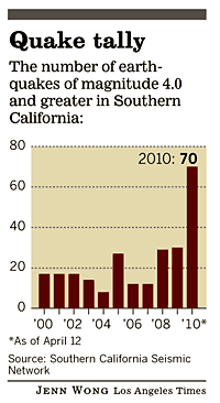 “…researchers say there has been an uptick in earthquakes this year. The number of earthquakes greater than magnitude 4.0 in Southern California and Baja California has increased significantly in 2010. There have been 70 such quakes so far this year, the most of any year in the last decade. And it’s only April. There were 30 in 2009 and 29 in 2008. Seismologists said they are studying the uptick but cannot fully explain it. Major earthquakes tend to occur in cycles, and experts have said the region in recent years has been in a quiet cycle when it comes to sizable temblors.