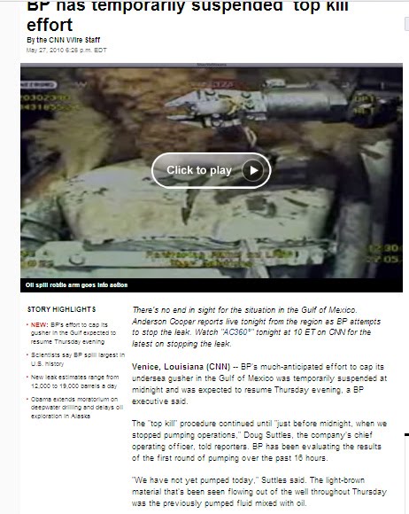 Then in a CNN press conference, BP executives admit they haven’t pumped a thing all day. I’ll post the link, but guess what? Half an hour after the story was published online, the paragraph about ‘not pumping all day’ was deleted. Good thing I got a screen shot. Screen shot below along with original reporting verbiage: