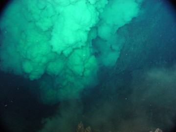 “View of a de-gassing event at Brimstone Pit at NW Rota-1 volcano releasing an extraordinary number of bubbles probably carbon dioxide. The yellow parts of the plume in the background contain tiny droplets of molten sulfur. Credit: NOAA”