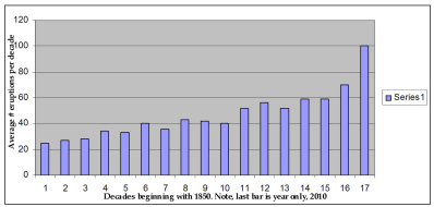 Here is a graph with the data from the above source. It depicts decade average eruptions since 1850. Note, last bar is year only, 2010. I’ll tell you why below: