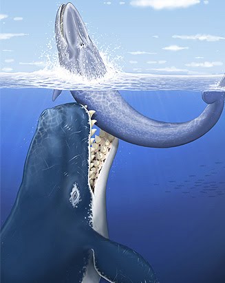Researchers have discovered the fossilised remains of an ancient whale with huge, fearsome teeth. Writing in the journal Nature, the scientists have dubbed the 12 million-year-old creature “Leviathan”. It is thought to have been more than 17m (56ft) long, and might have engaged in fierce battles with other giant sea creatures from the time. Leviathan was much like the modern sperm whale in terms of size and appearance. But that is where the similarity ends. While the sperm whale is a relatively passive animal, sucking in squid from the depths of the ocean, Leviathan was an aggressive predator. According to Dr Christian de Muizon, director of the Natural History Museum in Paris, Leviathan could have hunted out and fed on large sea creatures such as dolphins, seals and even other whales. “It was a kind of a sea monster,” he said. “And it’s interesting to note that at the same time in the same waters was another monster, which was a giant shark about 15m long. It’s possible that they might have fought each other”. The researchers speculate that Leviathan was able to feed on very large prey up to 8m long. It would catch the prey in its huge jaws and tear it apart quickly and effectively with its giant teeth.  Now, the discovery of the skull means that the Leviathan is not merely the stuff of myth and legend. “Finally we found it,” said Dr Lambert. ” It was a very exciting moment”.