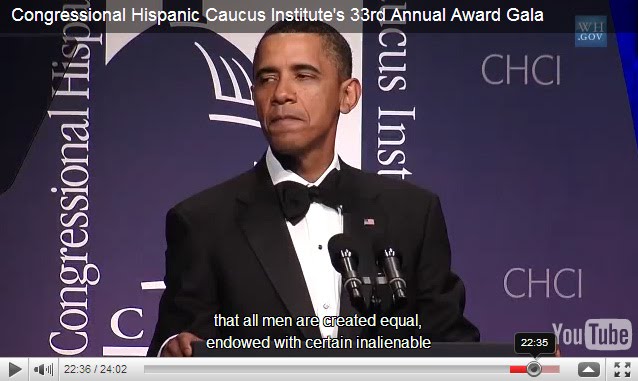 Friday night Obama spoke to the Congressional Hispanic Caucus Institute in a half-hour speech. When he got to the part about what unites us, you know, the Indians and the Mexicans and the Dutch and British and so on, even after “we didn’t always get along,” what eventually bound us together, what made us all Americans, are ‘faith and fidelity to shared values we all hold so dear…’ and then Obama speaks the first words to the preamble to the Declaration of Independence, “We hold these truths to be self evident, that all men are created equal….. endowed with certain unalienable rights, life and liberty, and the pursuit of happiness”. Notice anything missing?