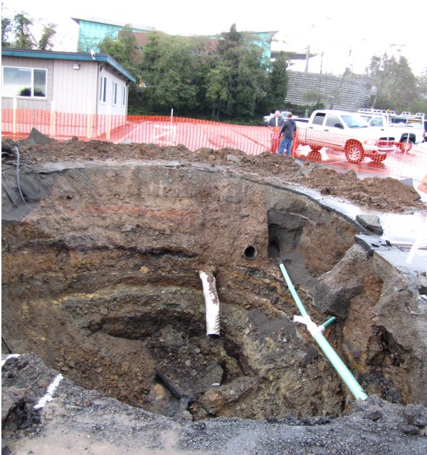 “A 20 foot by 30 foot sinkhole opened in front of Brookings City Hall overnight Sunday. The 23-foot deep hole was discovered by Brookings police officers at about 1:30 a.m., Lt. Donny Dotson said. City crews worked through the night to discover the extent of the damage and prevent the situation from worsening, Public Works Supervisor Bob Schaefer said Sunday afternoon. “They were able to stabilize the walls a little bit,” Schaefer said. Police department offices are close to the opening. Police will monitor the hole hourly. If there are any changes to the hole, crews will return. There is no immediate danger to city structures, but a large portion of Elk Drive crumbled into the hole. Elk Drive is closed between Fifth Street and Ross Road and is not expected to open for some time, Schaefer said. There will be no easy fix, as water from broken culvert gushed through the deep hole, carrying away even more soil. “This is going to be fairly extensive,” he said. “It’s very unstable ground and the weather isn’t good.”