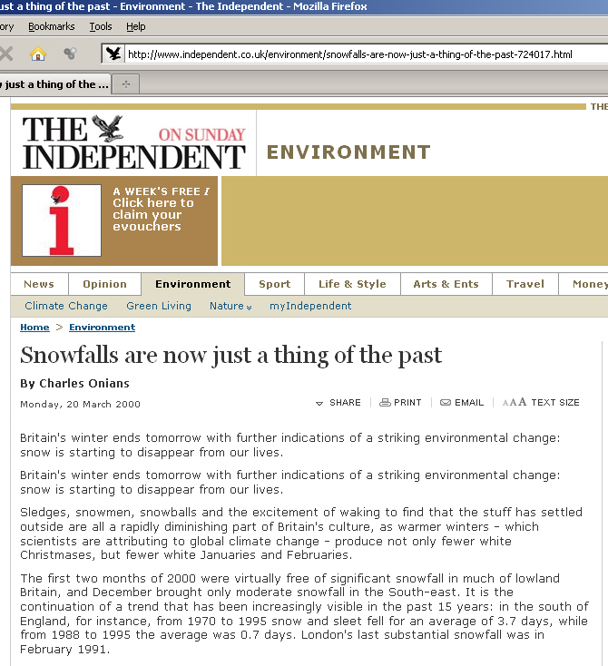 “Britain’s winter ends tomorrow with further indications of a striking environmental change: snow is starting to disappear from our lives. Sledges, snowmen, snowballs and the excitement of waking to find that the stuff has settled outside are all a rapidly diminishing part of Britain’s culture, as warmer winters – which scientists are attributing to global climate change – produce not only fewer white Christmases, but fewer white Januaries and Februaries.”