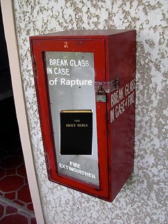 I am following the burden from the Spirit to make a “Rapture Sheet”. It is a one-page explanation of what happened, why it happened, and what the left behind people should do. It is one page, front and back. I am putting it inside a new bible, placing post-it notes on the salient bible verses, and wrapping in saran wrap with the title that says, “In case of rapture, open here”. What more important fire extinguisher is there than the bible? The altered photo below is only a pun, of course I am not making glass cases. I plan to put several wrapped bibles at work, places where people sit at a common desk and use the phone. Maybe you have a break room or a lunch room or a common area to just quietly place a bible with its explanatory sheet inside, where it will be seen and the existence of it will sink in over the next months. When the moment comes maybe someone will say, “Hey! I saw a bible over there once, let’s go get it!”