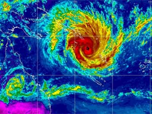 | Cyclone Yasi bearing down on the northeast corner of Australia, already flooded from weeks of rains. |
