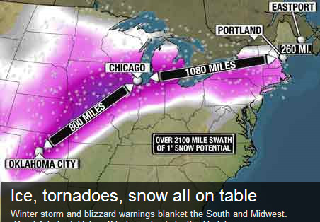 In America, the headlines are also reporting on another monster storm. A once in a lifetime, record setting, deadly storm. This time it’s snow and ice. “A monster winter storm took aim at a third of the nation Monday, threatening to lay a potentially deadly path of heavy snow and ice from the Rockies to New England, followed by a wave of bitter, bone-rattling cold that could affect tens of millions of people.” Not just millions affected, but tens of millions. The Washington Post talks of the Midwest and New England being buried. “National Weather Service advisories and warnings are in effect in more than 20 states as a powerful storm gets organized in the Midwest. A blizzard warning is in effect for Chicago, where 12 to 20 inches of snow is possible. Other cities which may experience blizzard conditions include Tulsa, Wichita, Kansas City, and Detroit. The Chicago Tribune’s Weather Center cautions: “Snowfall totals in excess of 12 inches coupled with winds of 25 to 40 mph will make long distance travel extremely dangerous if not impossible.”