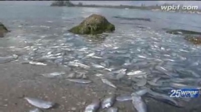 Meanwhile, 50 miles up the coast at Sebastian Inlet, FL, locals are stunned by a fish die-off of massive proportions. The lead sentence in the video-story is “We’re talking a lot of fish…biologists say up to a million.” There were so many dead fish that locals who have lived there for years were “stunned.” The biologists’ theory is that the fish are deliberately bunching up together in the shallow waters, but because there are so many of them, they use of all the available oxygen…and asphyxiate. They said that the species was menhaden, which makes it unusual behavior for that kind of creature.