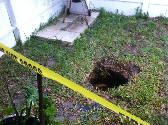 -Plant City FL: “A woman suffered minor injuries after she was walking around her backyard when the ground underneath her caved in and she fell into a sinkhole Monday morning.” Well!