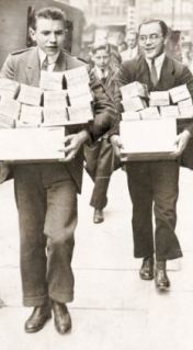 Weimar Republic: German businessmen carrying armfuls of worthless money during the great depression. source.
