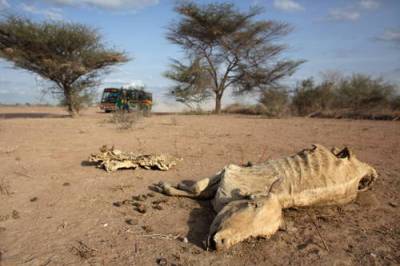 “Above, A dead cow lies on the ground as a bus travels past near the giant Dadaab refugee settlement on July 21, 2011 in Dadaab, Kenya. Famine brought on by the drought has killed tens of thousands in the Horn of Africa.” (Photo by Oli Scarff/Getty Images)