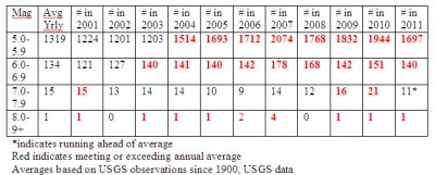 Any quake over 7.0 magnitude is considered ‘major’. On average, the USGS states that we can expect about 15 quakes of that magnitude each year. So far in 2011, the world has had 11 quakes of that magnitude. It is my estimate that due to the rate of strong and major quakes’ occurrence over these last five years (with those averages being regularly exceeded), the average will once again be exceeded this year as well.