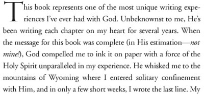 The mistake that people like Beth Moore and her followers make is that when special revelation is absent, they believe that God is NOT working, that He is NOT leading. So on the one hand we have a preacher of 50 years who says he has no special direct, auditory, or experiential connection to God nor the Holy Spirit that delivers personal direction to him, nor any mechanism that alerts him to when they are working. And when he writes a book he studies, reads, writes, edits, passes it to his circle of editors for revision and goes around again. And on the opposite end of the scale we have Beth Moore breathlessly saying that God “whisked her to Wyoming” where wholly perfect books are delivered through her hand whilst she is having lively conversations in complete sentences with the Spirit.