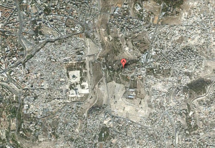 Here is an aerial view of the Mount of Olives. To the left of the pin is a valley and then another mount, the Temple Mount complex. North is to the top.
