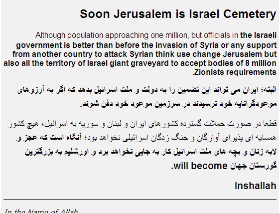 An Iranian analyst posted on his blog that Jerusalem will become the biggest graveyard in the world. The blog page is in Persian. Reza Kahlili translated the page and brought it to the West’s attention, writing, “Iranian analyst Alireza Forghani boasted today [on his blog] that Jerusalem, which he claims was invaded over 50 years ago by the “pig-faced” Jews, will soon become a mass “graveyard” for the Israeli people.”