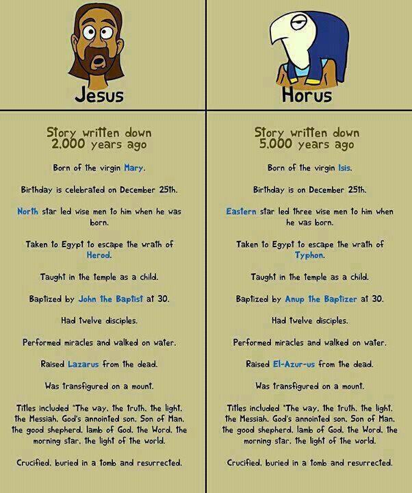 Much more at the source as to why this side-by-side comparison of Jesus and Horus is a fallacy of the false cause and a terminological fallacy: GotQuestions.