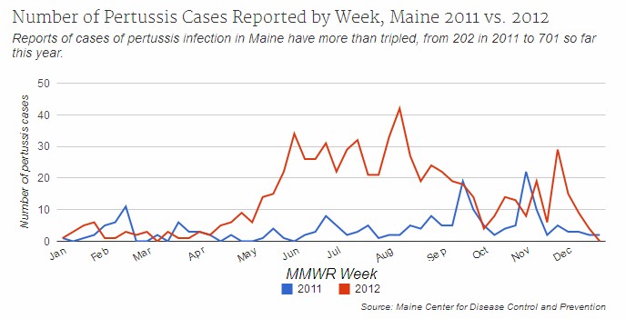 “Reported cases of whooping cough in Maine more than tripled this year, in line with a national trend that resulted in the worst year of pertussis infection in the United States in more than 50 years.”