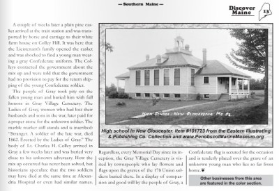In Gray, Maine, a large town just north of Portland, there is a town cemetery. Amid all the graves marking the founders and farmers and sundry Yankees, lay a Confederate soldier. He died during the second fight at Bull Run, most likely. Along with him in the long-ago battle, historians think, also died a Union soldier from Gray named Lt. Charles H. Colley. Gray sent more men and boys to the Civil War, proportionately, than any other Maine town. Over 200 went to fight, and as happened with Lt. Colley, many did not return alive.