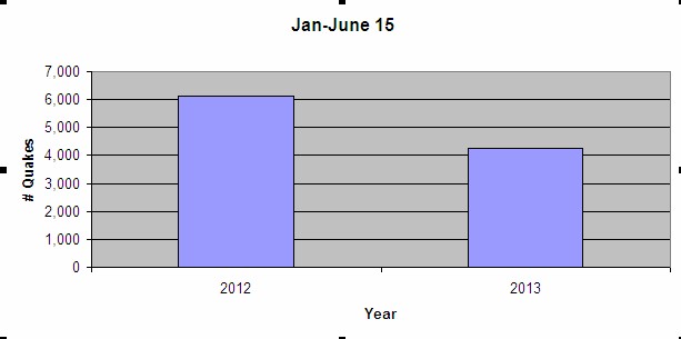 Looking at a longer term trend for quakes between 4.0-9.9 magnitude, from Jan-June for the last 7 years:
