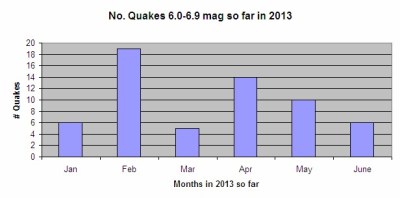 United States Geological Society (USGS) rates a quake major if it is over 6.0 in magnitude. Each year, the average number of 6.0-6.9 quakes occurring in that range for the entire year is 134. So far this year (2013) there have been 60 in the 6.0+ range. There have been four this week.
