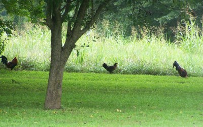 I had a few visitors this morning. I’ve had turkey vultures, doves, eagles, hawks, and geese. But never chickens. They contentedly pecked around under the apple tree until they heard my door open. Then they lined up and trotted off at the hay field border.