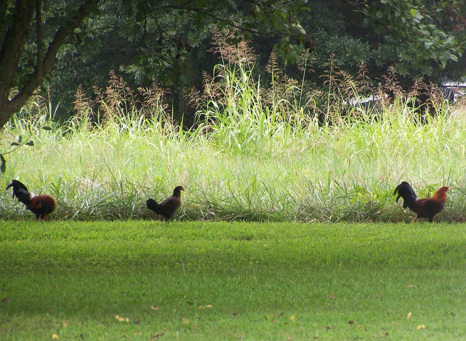 I had a few visitors this morning. I’ve had turkey vultures, doves, eagles, hawks, and geese. But never chickens. They contentedly pecked around under the apple tree until they heard my door open. Then they lined up and trotted off at the hay field border.