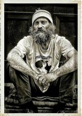 First: the dirt on the man looks real. Do the homeless in tv shows ever really look homeless? No, and that is because it takes a long time to get grime under the first layer of skin cells to become an almost permanent member of your body. There is a look to homelessness that comes from months and years of no access to proper sanitary conditions. The man in the photo looks homeless. Absolutely. And it turns out, that he is.