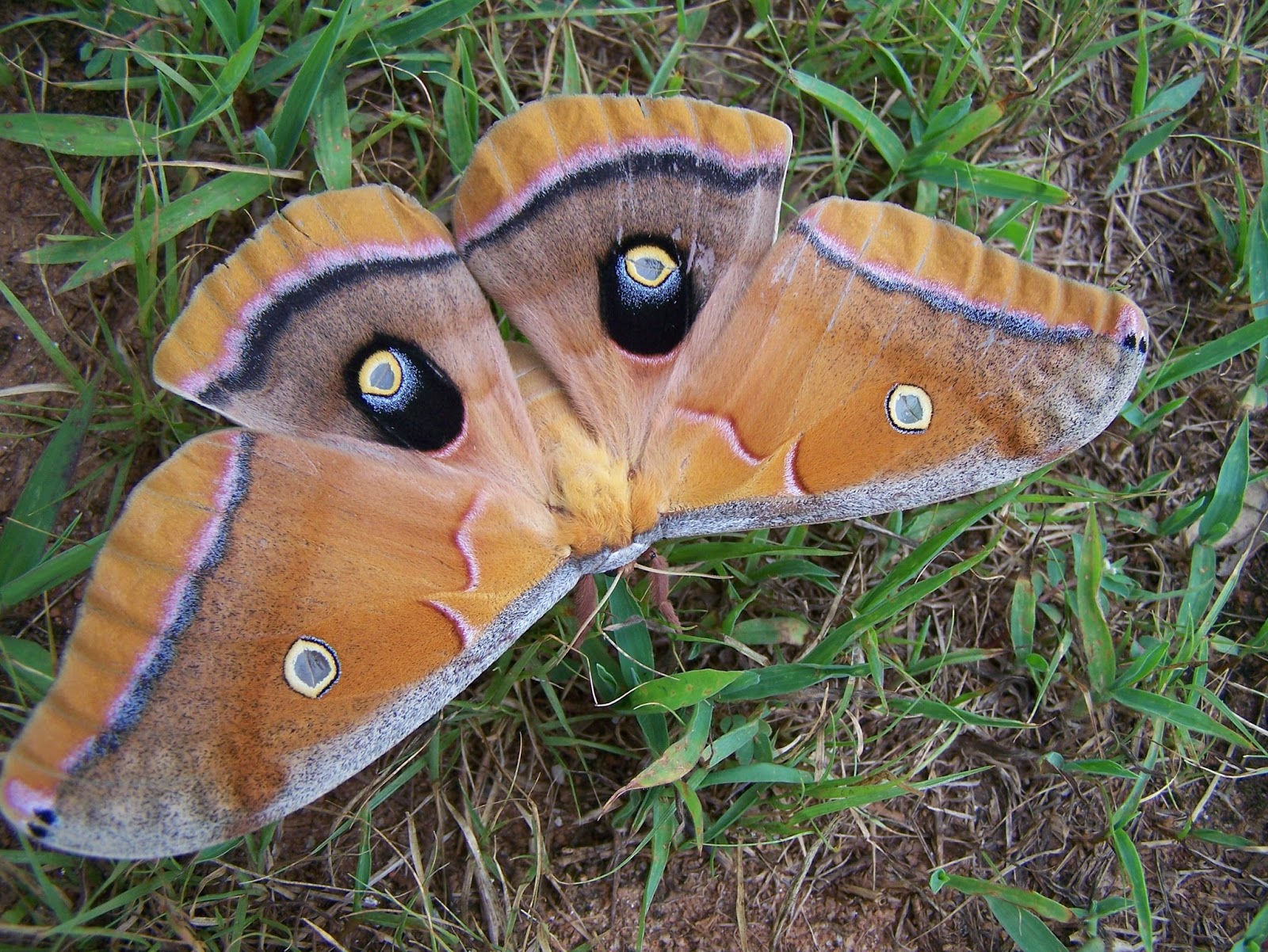The one I saw was a female, the narrow antennae gives her away. The polyphemus moth’s entire existence is to reproduce and one she has mated and laid her eggs, she dies. This one was gently expiring on the ground after fufilling her one and only duty. 😦