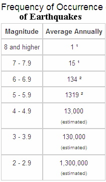 This week there have been 258 quakes over 2.5 magnitude worldwide (as of 8:30AM Sunday 8/18). The number of quakes per year are calculated by USGS and averaged out as the following: