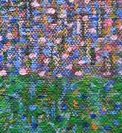 Sunday Afternoon on the Island of La Grande Jatte (1884-1888) is one of the most famous paintings in the world. … At left you see a closeup of Seurat’s painting. It is a closeup of the the man laying down on the lower left. Even thought he appears to be wearing white pants, as you can see, the part of the pants in the shadow just above the grass has no white in it. It’s only when you look at it from a distance that the colors blend in. Seurat spent two years on this painting. He carefully planned it out with several sketches first.