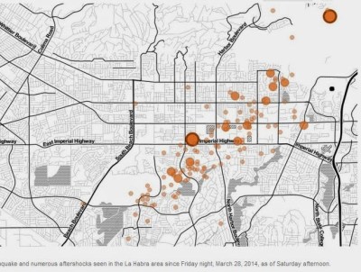 “A strong aftershock to Friday’s 5.1-magnitude earthquake in Orange County shook Southern California this afternoon. The U.S. Geological Survey reported the 4.1-magnitude tremor struck two kilometers southeast of Rowland Heights at 2:32 p.m. The Rowland Heights office of the Los Angeles County Sheriff’s Department said there were so far no reports of damage. More than 100 aftershocks have rattled the region. No major damage and no injuries have been reported, but police in the city of Fullerton say 20 apartment units and half a dozen homes were red-tagged, displacing 83 people. Some residents have since returned to their homes.”