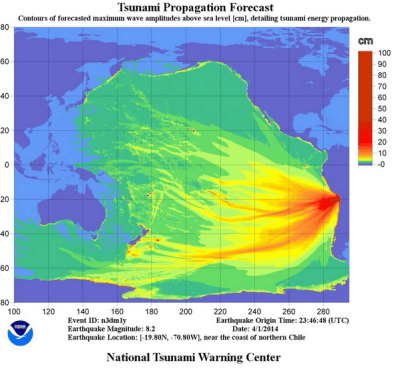 The United States Geological Survey recorded a large 8.2 quake off the coast of Chile this evening. Chilean seismologists put it at 8.3. There have been several large aftershocks, including a quake at 6.2 magnitude. Tsunami watches and warnings have been issued for many nearby nations, and across the Pacific to Hawaii and Southern California. Though they expect the wave height to be mere inches by the time it reaches SoCal.