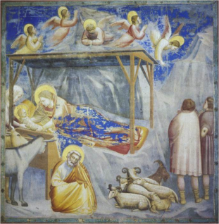 At least at the end of the Gothic age as the Renaissance dawned, Giotto, the era’s most famous painter, was depicting angels as full grown men. Below is his “Nativity” from the Arena Chapel, Late Gothic/Early Italian Renaissance 1305-1306. The angels are engaged in full-blown worship of God. They had wings, unfortunately, but at least they were fully grown. By the beginning of the Renaissance around 1420, they had been reduced to putti/cherubs.