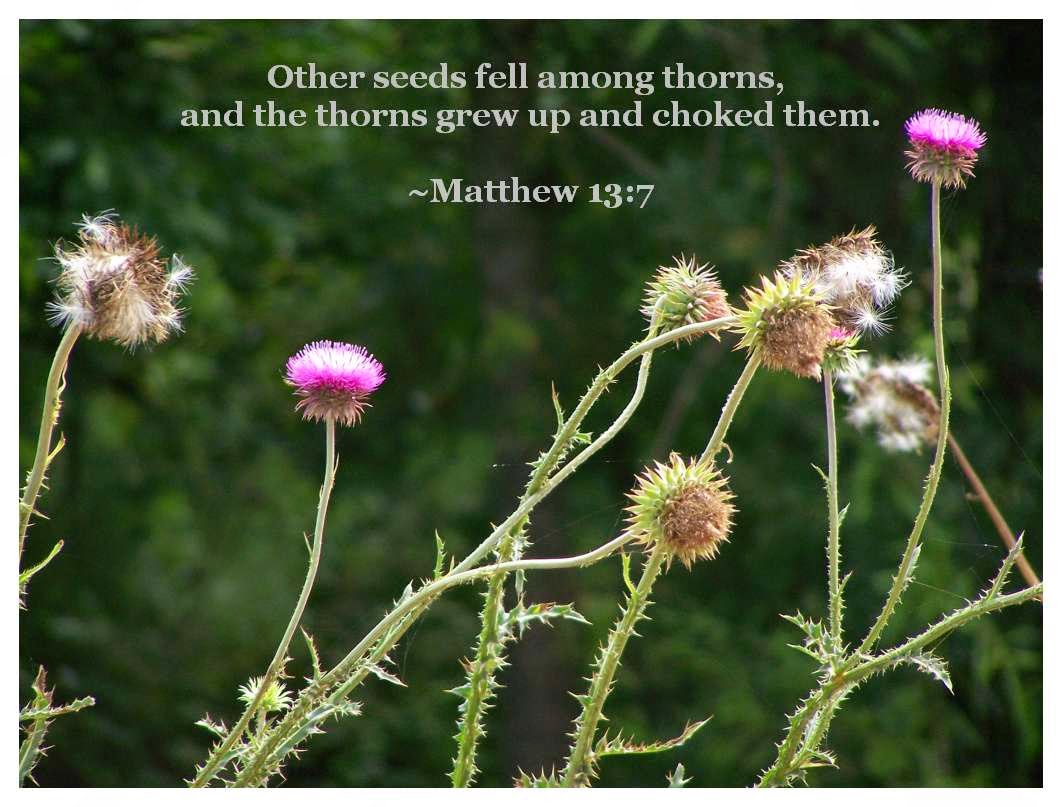 Posted in parable of the soils, scripture photo Scripture photo: thorny soil Posted on July 23, 2014May 9, 2016 by elizabethprata EPrata photo Share this: Click to share on X (Opens in new window) X Click to share on Facebook (Opens in new window) Facebook Click to share on Pinterest (Opens in new window) Pinterest Click to share on Reddit (Opens in new window) Reddit Click to share on Tumblr (Opens in new window) Tumblr More Click to share on WhatsApp (Opens in new window) WhatsApp Click to share on Telegram (Opens in new window) Telegram Like Loading... Author: elizabethprata Christian writer and Georgia teacher's aide who loves Jesus, a quiet life, art, beauty, and children. View All Posts