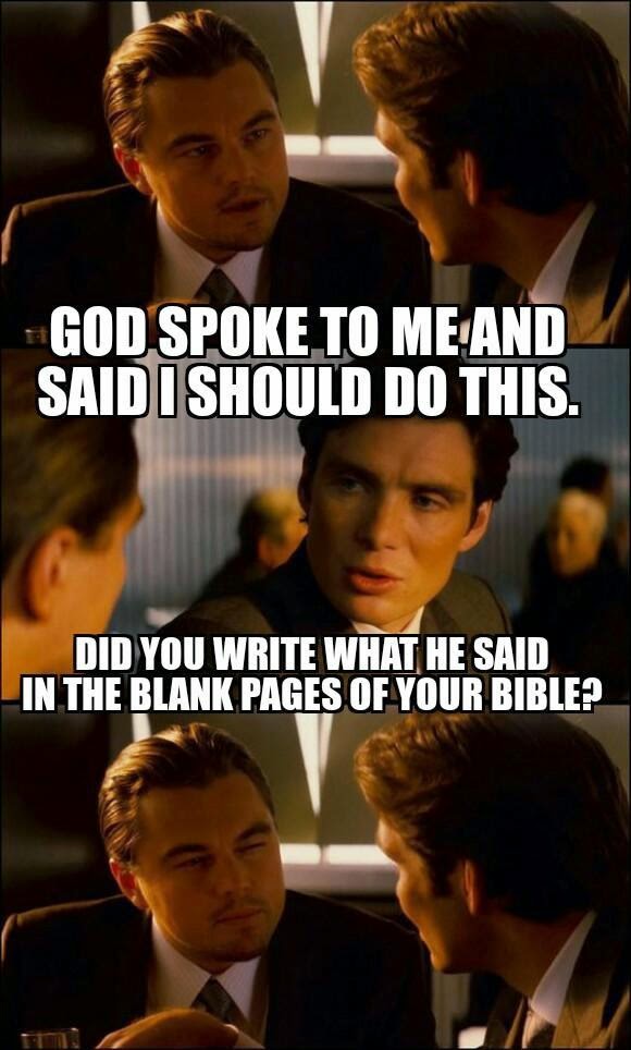Posted in humor, meme "God told me to…" Posted on September 15, 2014May 9, 2016 by elizabethprata Twitter meme. Good one! Share this: Click to share on X (Opens in new window) X Click to share on Facebook (Opens in new window) Facebook Click to share on Pinterest (Opens in new window) Pinterest Click to share on Reddit (Opens in new window) Reddit Click to share on Tumblr (Opens in new window) Tumblr More Click to share on WhatsApp (Opens in new window) WhatsApp Click to share on Telegram (Opens in new window) Telegram Like Loading... Author: elizabethprata Christian writer and Georgia teacher's aide who loves Jesus, a quiet life, art, beauty, and children. View All Posts