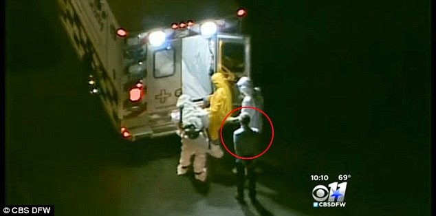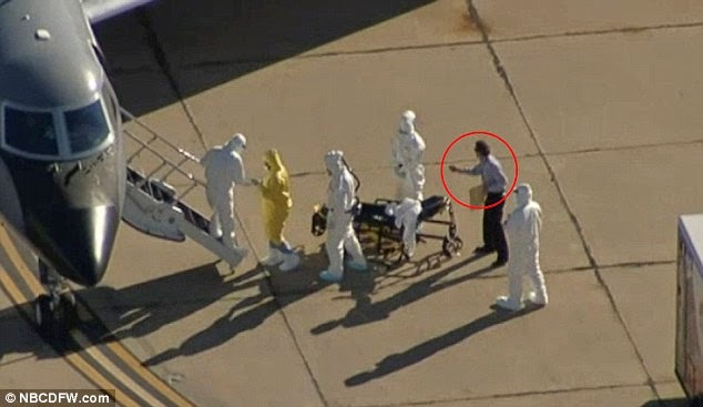 As news helicopters swarmed over Dallas’ Love Field this evening to watch the second U.S. nurse to contract Ebola board a private plane bound for Atlanta, one lone mysterious man stood out from the pack. Holding a clipboard and directing the transfer, the unidentified man seemed to be the only person on the tarmac without protective clothing, wearing just a button down shirt and trousers.