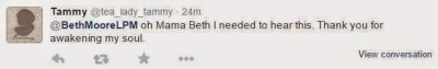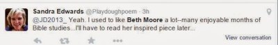 I did not have to cherry pick these. It was a day where Mrs Moore had written some drivel on her blog and the followers were discussing it in droves. There was a lot of chatter. There was SO MUCH of this kind of adulation and worship of Beth Moore it was actually hard to narrow it down to these two.
