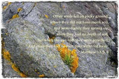 Posted in scripture photo Scripture photo: Rocky ground Posted on July 15, 2015May 9, 2016 by elizabethprata EPrata photo Share this: Share on X (Opens in new window) X Share on Facebook (Opens in new window) Facebook Share on Pinterest (Opens in new window) Pinterest Share on Reddit (Opens in new window) Reddit Share on Tumblr (Opens in new window) Tumblr More Share on WhatsApp (Opens in new window) WhatsApp Share on Telegram (Opens in new window) Telegram Like Loading... Author: elizabethprata Christian writer and Georgia teacher's aide who loves Jesus, a quiet life, art, beauty, and children. View All Posts