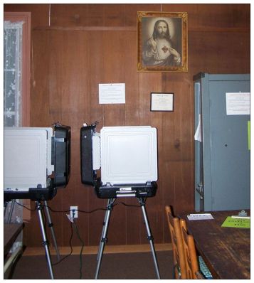 | A polling station, with watchful Jesus over the government…EPrata photo |