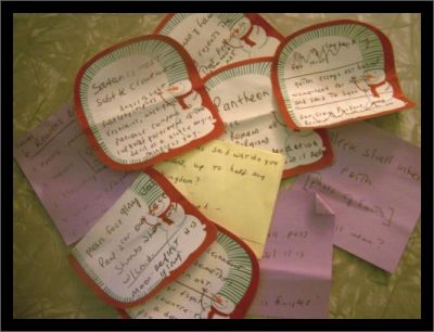When I studied the Bible before the Plan, I’d just pick a book and read it through. I stopped reading for the day when I felt full up and unable to absorb any more. Sometimes that occurred after half a chapter. Other times I read two or three chapters before I felt unable to spiritually absorb any more. Usually while reading, my mind raced with ideas and questions and I eagerly looked up parallel verses, the Greek words, or other verses the Spirit brought to mind. I have a small Post-it notes next to my table and I jotted down ideas and thoughts to pursue later. Here is the pile of Post-its I haven’t yet pursued, written before I started the plan: