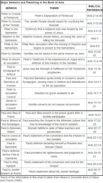 Below is a list of sermons preached in Acts along with a short description and reference for each are listed below. Not every passage below quotes the preacher’s sermon directly, but each passage will share something important about the content of the sermon or the response of the hearers. (source & chart below)