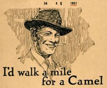 In the bad old days, billboards were allowed to promote cigarettes. Everyone smoked and the cancerous result was either not known or squashed or ignored as health concerns arose over the decades. Some advertising tag lines stick. One of these that lasted for decades is Camel cigarettes’ “I’d walk a mile for a camel!” which first appeared in the 1920s.Did you know that Camel was the first pre-rolled cigarette? Anyway the ad’s tag line indicated that the product was so good that people would expend effort such as walking distances in order to get it.