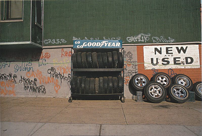 If I’d like to concentrate on street photography, as good as it is to be on the same track as someone like Naar in terms of interest in these kinds of scenes, it’s the execution that matters. I need to improve my composition, framing, and bravery in getting close to the moment. In Naar’s scene of the police car, what makes it good is that the cop is in the car. When you look closely, you see his arm in the window. This brings life to the scene. The handbills, not only colorful and framed well, but his decision to take it with the bold clenched fist above them gives the picture a foreign feel, and vaguely threatening. The new & used tires, the inclusion of the graffiti and the loneliness of both displays of the tires makes one ask, which are new and which are used? They all look tattered.