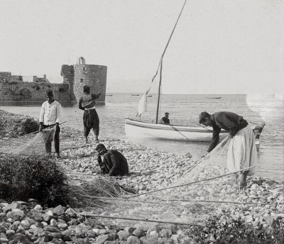 | City of Tiberias – Jewish Fishermen by the Sea of Galilee, Palestine, a photograph by William H. Rau, 1903. Public domain |