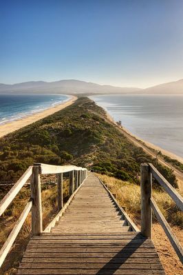 | The sandy isthmus or tombolo connecting North and South Bruny Island in Tasmania, Australia |