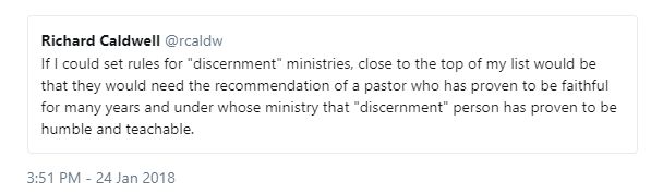 To me, the big issue isn’t discernment ministries. It’s lack of discernment from elders, pastors, and leaders who are actively teaching inside local churches. And it’s lack of tolerance or respect to hear those members out when an issue does arise who either trying to follow Hebrews 5:14’s example, or specifically attempting to edify their home church via the spiritual gift of discernment .